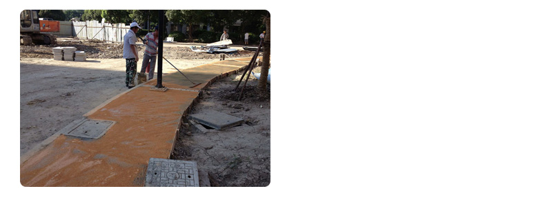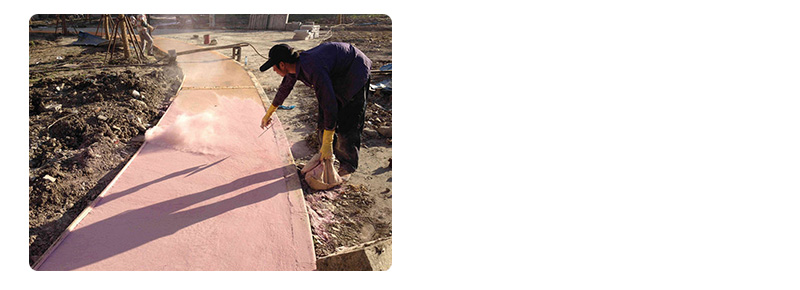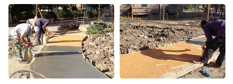待混凝土表面初凝(具体时间因温度、湿度而定),均匀撒布颜色强化齐材料用量的三分之二(常规2㎏/㎡、)。