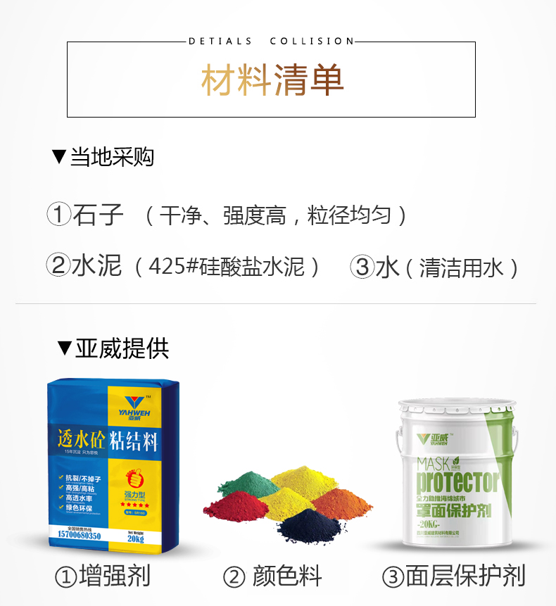 透水混凝土组成材料:颜色料、透水砼粘结料/增强剂/胶粉、密封罩面剂三种材料组成。
