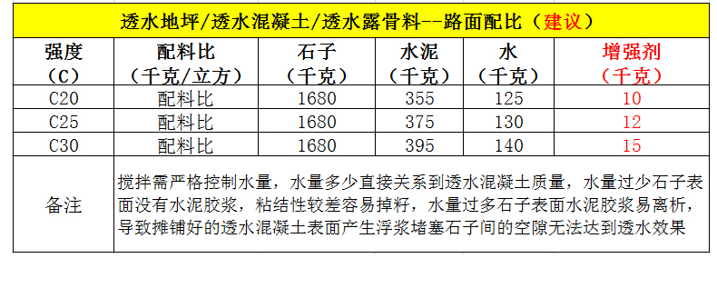 2、每立方(kg)对应比例:透水增强料:水泥:细石=10:350:1680
